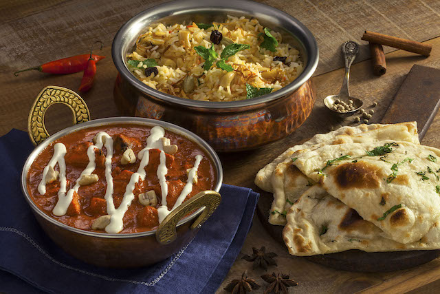 Butter Chicken. Cubos de frango marinados no iogurte e especiarias, cozidos em molho de tomates frescos e manteiga, decorados com creme. Kashmiri Pulao, arroz com especiarias e frutas secas, e Pudina Naan, pão assado no ‘tandoor’ com hortelã.