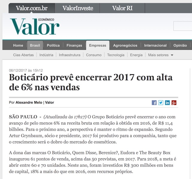 ‘valor_grupoboticario news-05122017’Publicado dezembro 11, 2017 em 641 × 600 em Grupo Boticário prevê crescimento de mais que o dobro do mercado nas vendas em 2017, by Vanessa Malucelli ‹ Return to post Deixe um comentário Cancelar resposta Δ