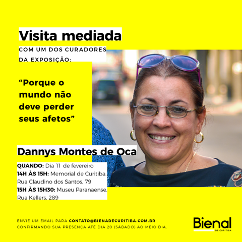 Uma das curadoras da exposição “Porque o mundo nunca deve perder seus afetos”, Dannys Montes de Oca (Cuba), oferecerá uma visita guiada gratuita pela exposição, em inglês/espanhol com tradução simultânea. O evento será neste domingo, dia 11 de fevereiro, das 14h às 15h no Memorial de Curitiba, seguindo às 15h para o Museu Paranaense, locais onde se encontram as obras da mostra.