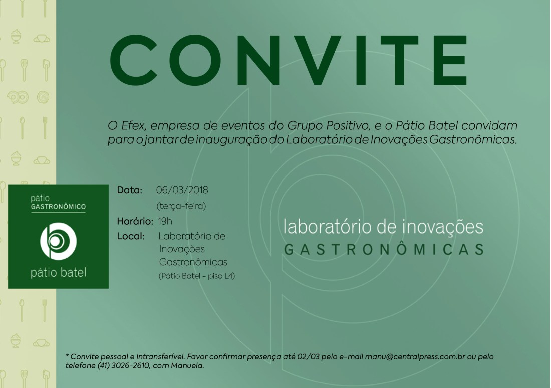 ‘CONVITE_PATIO+’Publicado março 6, 2018 em 2481 × 1749 em Pátio Batel & Pátio Gastronômico ‹ Return to post Deixe um comentário Cancelar resposta Δ