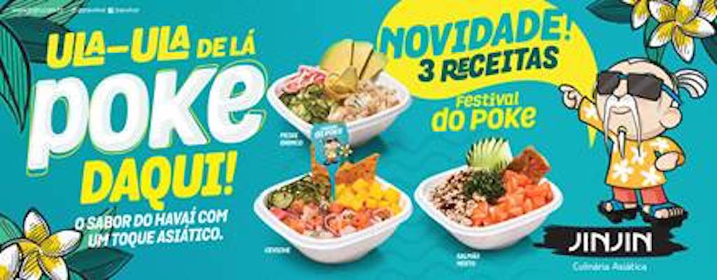 Uma tendência gastronômica trazida do Havaí chegou à rede Jin Jin:o poke havaiano. A deliciosa iguaria que a tradicional rede de franquias especializada em culinária asiática traz aos clientes é o prato principal do Festival Poke Jin Jin, que começa a partir do dia 2 de abril com o lançamento de três novas receitas: Ceviche, Salmão misto e Peixe branco.
