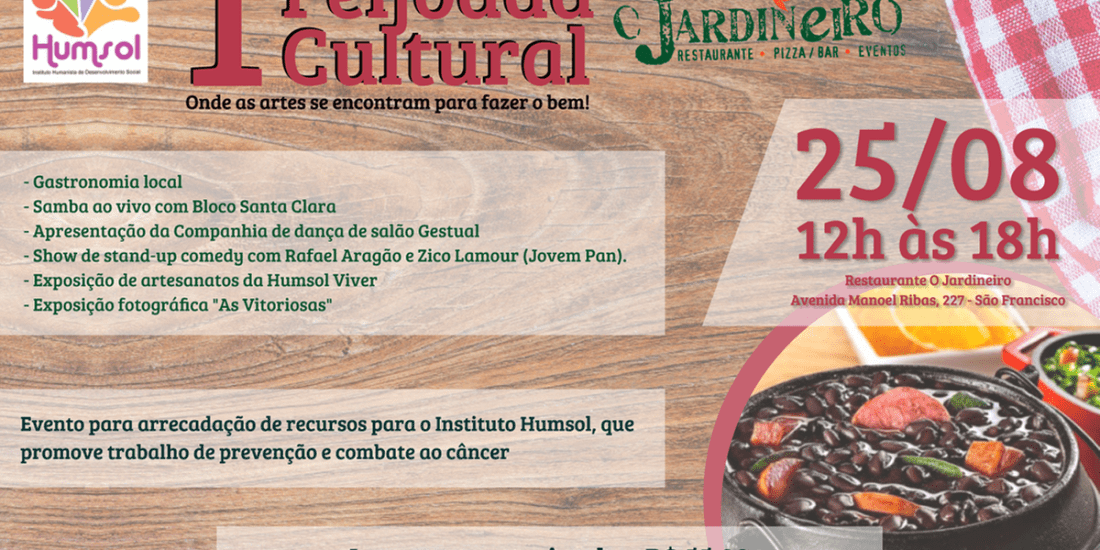 A Primeira Feijoada Cultural tem como objetivo fazer o bem. A data multicultural contará também com uma exposição de artesanatos da Humsol Viver e terá alguns artigos para venda, cuja renda obtida será revertida para os projetos de prevenção e combate ao câncer promovidos pelo Instituto Humsol. E mais: a exposição fotográfica intitulada “As vitoriosas” completa o dia, trazendo por meio da série de fotografias histórias de várias mulheres que lutaram e venceram o câncer.