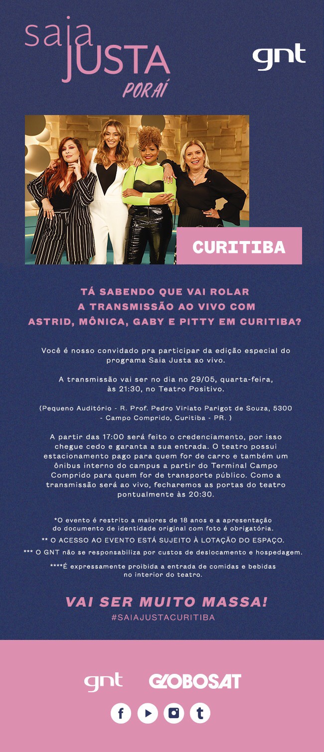 ‘Convite’Publicado maio 30, 2019 em 650 × 1510 em GNT fez uma edição especial do Saia Justa & Curitiba recebe o primeiro “Saia Justa Por Aí” do ano ‹ Return to post Deixe um comentário Cancelar resposta Δ