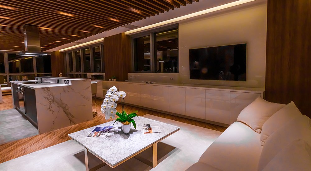 Sala presidencial com 200m² apresenta cozinha, dois livings e escritório totalmente integrados e com mobiliário da Florense Carlos de Carvalho