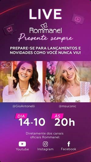 A Rommanel irá realizar sua primeira Live Shop no dia 14, com a apresentação da atriz Giovanna Antonelli e Maria Eugênia Suconic. Na live, a atriz apresentará sua nova coleção em parceria com a Rommanel, a “Do Seu Jeito”, que chega às lojas Rommanel no dia 15 de outubro, e abordará temas de beleza e empoderamento feminino, além da revelação de uma grande surpresa para as consultoras. A “Do Seu Jeito” conta com joias versáteis e perfeitas para composições em diferentes estilos e aposta na diversidade e na versatilidade da mulher brasileira, com peças cheias de personalidade.