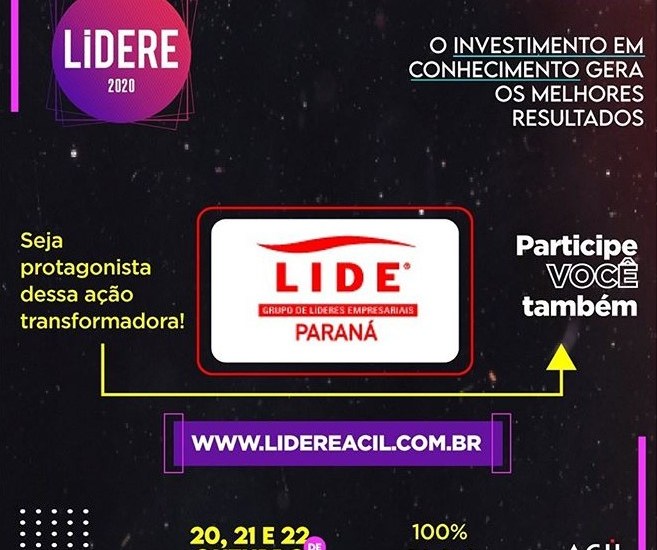 O ano de 2020 gerou a necessidade de inovação e mudança de mindset de empresários, mas nem sempre é fácil assimilar tantas mudanças. Com o objetivo de provocar discussões para gerar inspiração sobre gestão, inovação, liderança e empreendedorismo, um dos maiores eventos do Paraná, o Lidere 2020 realizado pela Acil – Associação Comercial e Industrial de Londrina, começa dia 20 de outubro e conta com o apoio do LIDE Paraná.