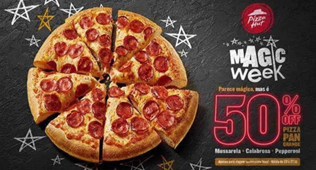 Na Magic Week, os sabores Mussarela, Calabresa e Pepperoni terão 50% de desconto no pedido da Pizza Pan Grande com 12 pedaços. A promoção é válida pelo canal To Go – também chamado Viagem – e consumo no local.