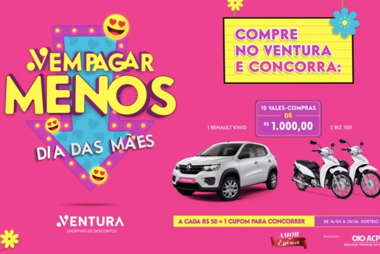 Quem fizer compras a partir de R$ 50,00 nas lojas do Ventura ganha um cupom que dá o direito de participar de sorteios. Para isso, o shopping fechou uma parceria com a Associação Comercial do Paraná – ACP. Entre os prêmios estão: