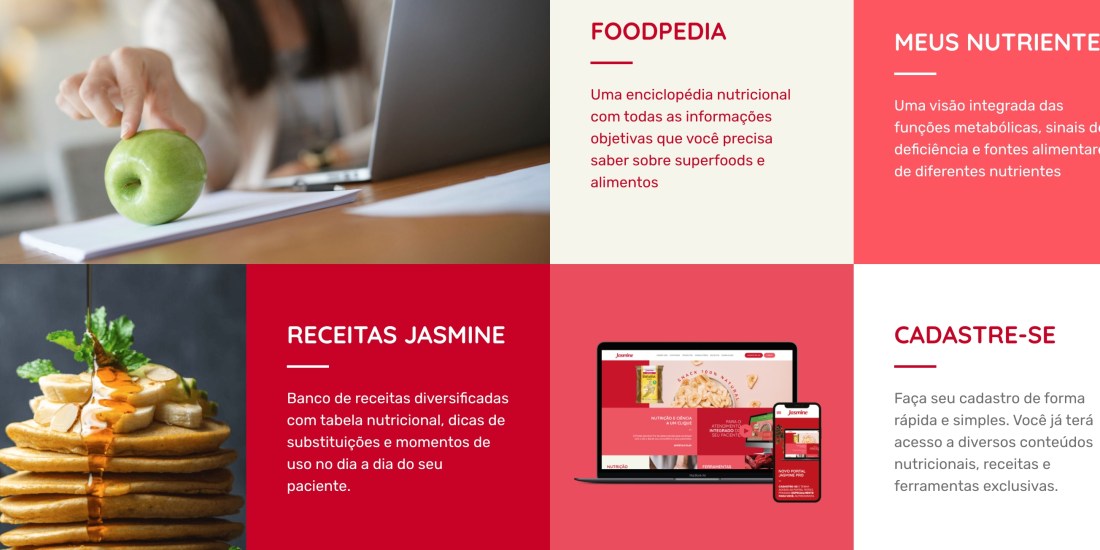 O portal disponibiliza conteúdos técnicos, atualizados periodicamente, sobre nutrientes e as respectivas atuações no organismo, biodisponibilidade, absorção, quantidades recomendadas e informações sobre os alimentos que mais oferecem vantagens ao corpo humano, quando consumidos da forma e na medida corretas. Outro diferencial é a aba “Meu Guia Jasmine”, que apresenta informações nutricionais detalhadas sobre todos os produtos da marca. Nela são indicados os melhores momentos para consumo, a fim de facilitar a prescrição dos alimentos pelo nutricionista no dia a dia do consultório.