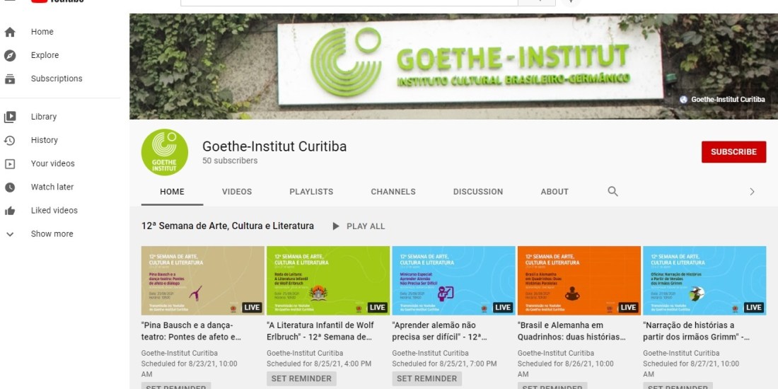 As atividades do Goethe-Institut Curitiba fazem parte de mais de cem atrações gratuitas da 12ª Semana de Arte, Cultura e Literatura, que busca ampliar o repertório artístico, cultural e pedagógico dos profissionais da educação, assim como da comunidade em geral. A programação completa está disponível no portal aprendere.curitiba.pr.gov.br e inclui rodas de leituras, palestras, cursos, espetáculos filmes, entre outros, alguns com exibições abertas e outras com necessidade de inscrições prévias.