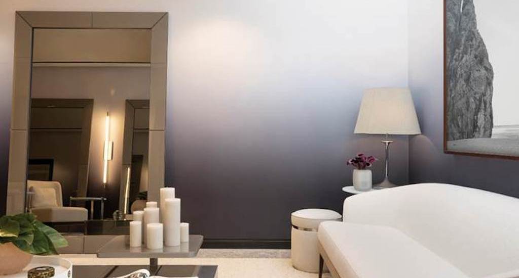 O espaço segue um visual estimulante sem deixar de lado o toque intimista, com destaque para o efeito degradê criado pelo papel de parede, que vai do chumbo ao branco. A paleta cromática evidencia o mobiliário escolhido para compor o ambiente, como a generosa e moderna cama central e a escrivaninha aos seus pés – que auxilia na função home office tão corriqueira nos dias atuais. Todos os ambientes são conectados por um único tapete de 2,5 x 10 metros da Botthe Handmade Rugs, conferindo a sensação de unicidade e potencializando o tom acolhedor com suas tramas naturais.
