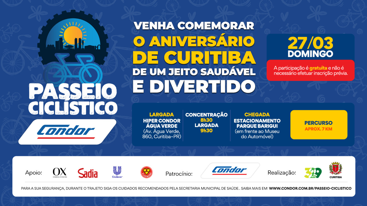 Após dois anos sem ser realizado de forma presencial em função da pandemia, o Passeio Ciclístico Condor em comemoração ao aniversário de 329 anos de Curitiba será feito no dia 27 de março. A realização é da Prefeitura de Curitiba, por meio da Secretaria do Esporte, Lazer e Juventude (Smelj), com patrocínio do Condor e apoio da Flora, BRF, Unilever e 3 Corações. A expectativa é que mais de 2.500 ciclistas participem dessa edição, que terá um trajeto de aproximadamente 7 km e parte do Condor Água Verde (com concentração a partir das 8h30 e saída às 9h30) e segue até o estacionamento do Parque Barigui, em frente ao Museu do Automóvel.