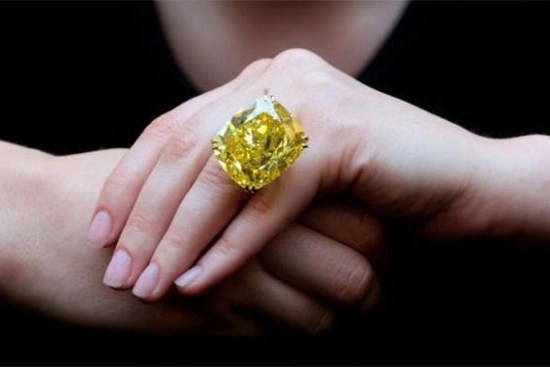 Vendido por nada mais nada menos do que US$ 16,3 milhões, o Vivid Yellow tem impressionantes 100,09 quilates, um número mágico para diamantes. Apresenta dois diamantes ao lado e tem um tamanho bastante grande para um anel.
