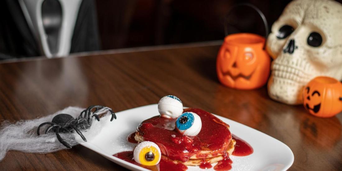 - Scary Pancakes, com 2 panquecas americanas fofinhas, calda de morango e olhos comestíveis.