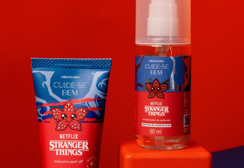 No dia 06 de novembro comemora-se o dia do Stranger Things Day, então o Boticário traz uma novidade que promete agitar os mundos dos cosméticos e do entretenimento, em parceria com Netflix lança linha de produtos de cuidados pessoais da série Stranger Things. Com intuito de deixar a rotina de autocuidado ainda mais especial, em edição exclusiva e limitada. Com todos os mistérios e diversão de Stranger Things, os fãs da série podem encontrar o Spray de ambiente Cuide-se Bem Stranger Things — ‘Cheiro de mistério no ar’, que traz o mood de mistério da série a cada borrifada de produto, com inspiração na floresta úmida e dark de Hawkins, cidade em que a série acontece. Com blend de ingredientes curiosos, o spray apresenta fragrância facetada e intrigante com aroma musk intenso. No skincare, inspirada no mundo invertido, a Máscara Facial Peel Off Cuide-se Bem Stranger Things — Terror dos Poros remove as células mortas e extermina a oleosidade excessiva da pele. A aplicação da máscara promete surpresas e selfies, com uma película que é puro brilho biodegradável.