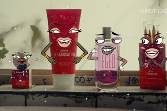 Nas cenas, ao terem a claquete para o corte de cena da série, todos os produtos das linhas ganham vida. Com ilustrações irreverentes de olhos, boca e braços, eles interagem entre si, ressaltando o “sinta na pele o que rola na série” com alto-astral. Em Sex Education, a cena se passa no banheiro da escola Moordale, onde Otis costumava aconselhar os colegas que também eram “pacientes”. Por lá, com tom jovem e descolado, Egeo Sex Education Desodorante Colônia, Loção Hidratante Desodorante Cuide-se Bem Menina Hidratante, Super Glitter Multifuncional Menina Brilhante e a Pallete de Lápis de Olhos ressaltam os pontos ideais para um ritual de empoderamento com base nos produtos de autocuidado e maquiagem.