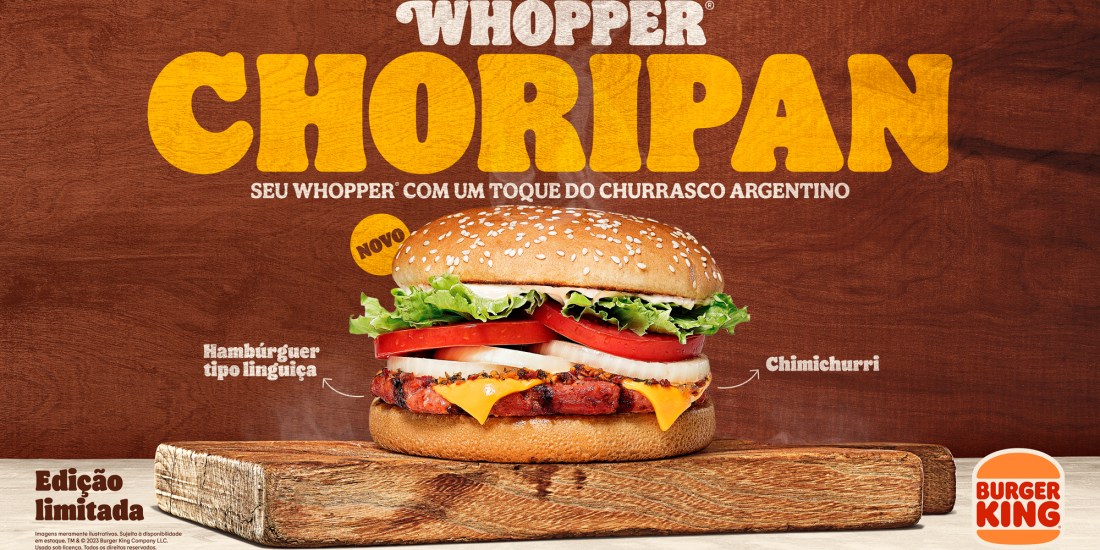 O Burger King® revela um novo produto em seu cardápio: o Whopper Choripan. Inspirado no churrasco argentino, o sanduíche traz uma combinação de ingredientes que promete agradar ao paladar dos amantes de um suculento sanduíche. Por período limitado, o lançamento estará disponível em todas as lojas do país com valores a partir de R$31,90 via balcão.