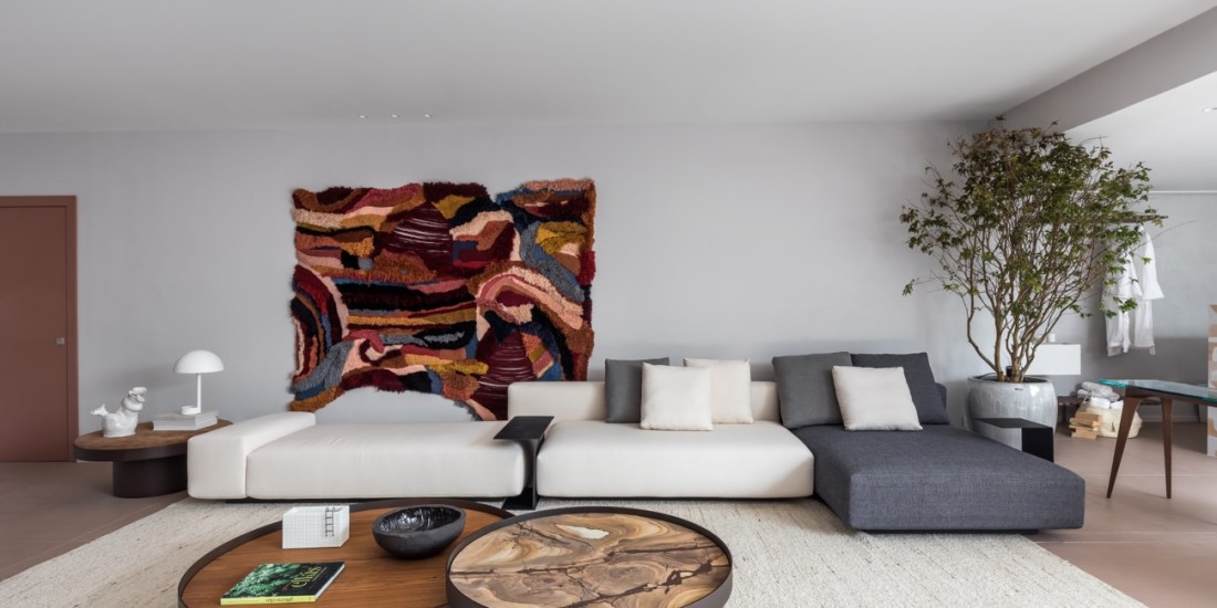 No living, peças de design brasileiro reúnem forma e função, dando ainda mais personalidade para o espaço. Além do amplo Sofá c328, da Carbono Design, se destacam os lançamentos da Estudiobola, disponíveis na Inove Design. Entre as peças escolhidas pela profissional para compor a proposta, estão a mesa de centro Aros e a poltrona Serena, com linhas suaves e contornos delicados – marcas registradas do trabalho de Flavio Borsato e Maurício Lamosa.