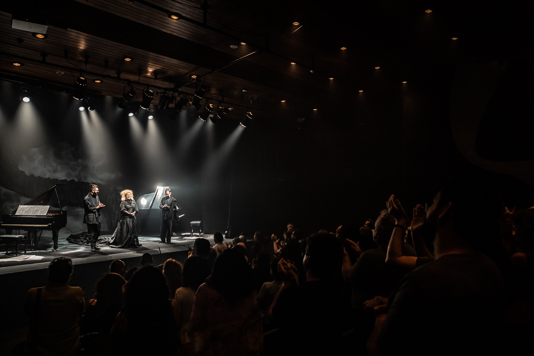 Sinopse – A Aforista apresenta como um dos personagens centrais o famoso pianista John Marcos Martins. Outro pianista, Polacoviski, tem um destino trágico. A narrativa desenvolve-se a partir das lembranças, pensamentos e imaginação da terceira personagem, a narradora, amiga de John Marcos Martins e de Polacoviski, e por eles apelidada de “aforista”. A narradora, que está sempre andando e enquanto anda, pensa em como se deu tudo. Sua relação com seus antigos amigos de faculdade, o caminho que cada um seguiu. E onde esses caminhos os levaram. E o quanto esses caminhos tomados influenciaram inclusive na vida uns dos outros. A música cumpre papel de destaque no espetáculo, sendo a atriz Rosana Stavis acompanhada por 2 pianos de cauda tocados ao vivo que duelam no palco e dão o tom da narrativa.