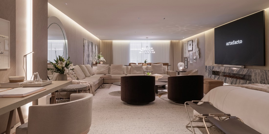 Numa atmosfera suave e envolvente, as cores se unem em uma paleta monocromática que vai desde os suaves beges até os profundos marrons. As nuances de tons terrosos enriquecem as poltronas de veludo, as mesas laterais de granilite e as mesas de centro e de jantar de ébano brilhante. Mármores, porcelanatos e amadeirados criam um mix de texturas que convidam a descobrir, tocar e sentir. Um acabamento marcante é o lançamento da Sudati, o MDF Basalto Português, que reveste os painéis das paredes.
