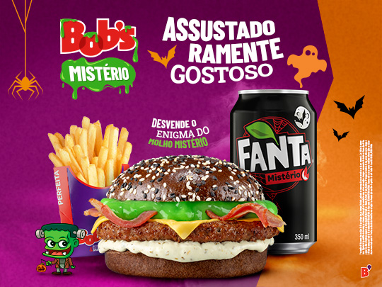 Com a proximidade do Halloween, que será celebrado no dia 31 de outubro, o Bob’s, primeira rede de fast food brasileira, anuncia o lançamento do Bob’s Mistério. Para entrar no clima da festa que vem ganhando popularidade no Brasil, a marca se junta mais uma vez à Fanta e traz um trio composto por um sanduíche com molho misterioso, batata palito e Fanta Mistério.