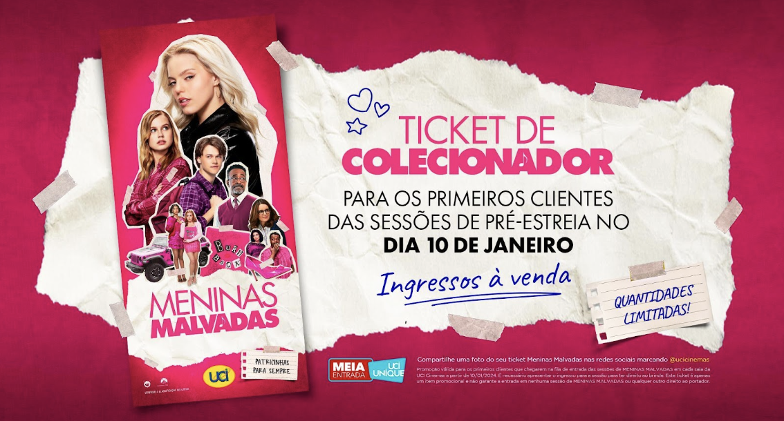 Um dos musicais mais aguardados de 2024, “Meninas Malvadas: O Musical”chega aos cinemas da Rede UCI com sessões de pré-estreia e os ingressos já estão à venda. O longa tem estreia marcada para o dia 11 de janeiro, mas como na quarta é dia de usar rosa, na UCI os fãs já podem conferir o sucesso a partir do dia 10. O filme é dirigido por Tina Fey e é uma releitura musical do clássico de 2004 com o mesmo nome, que arrecadou cerca de US$130 milhões de bilheteria mundial. Os primeiros a assistirem ao filme na UCI no pré-lançamento levam para casa um brinde especial: um ticket de colecionador.
