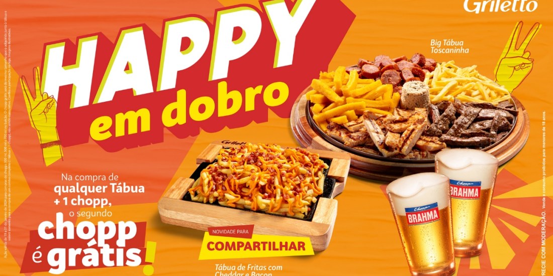 O Griletto, rede de franquias da Halipar (Holding de Alimentação e Participações) especializada em grelhados, inicia o ano em que completa duas décadas de fundação com a campanha Happy em Dobro. De 19 a 31 de janeiro, o consumidor que comprar, nos balcões da rede, uma tábua e um chope, levará a segunda unidade da bebida gratuitamente.