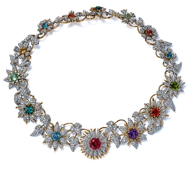 Jean Schlumberger by Tiffany Fleaurage necklace in18k yellow gold and platinum with multicolored gemstones of over 37 total carats and diamonds