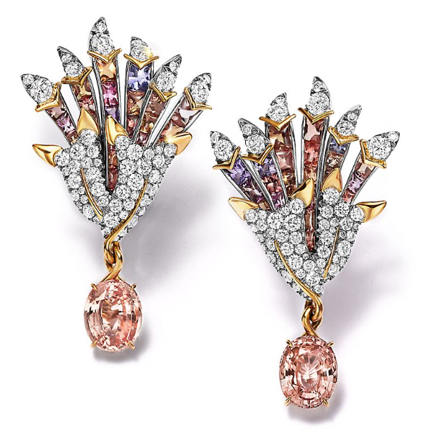 Earrings in platinum and 18k yellow gold with Unenhanced Orange Sapphires of over 9 total carats, unenhanced Umba Sapphires and diamonds from the 2023 Tiffany Blue Book Collection