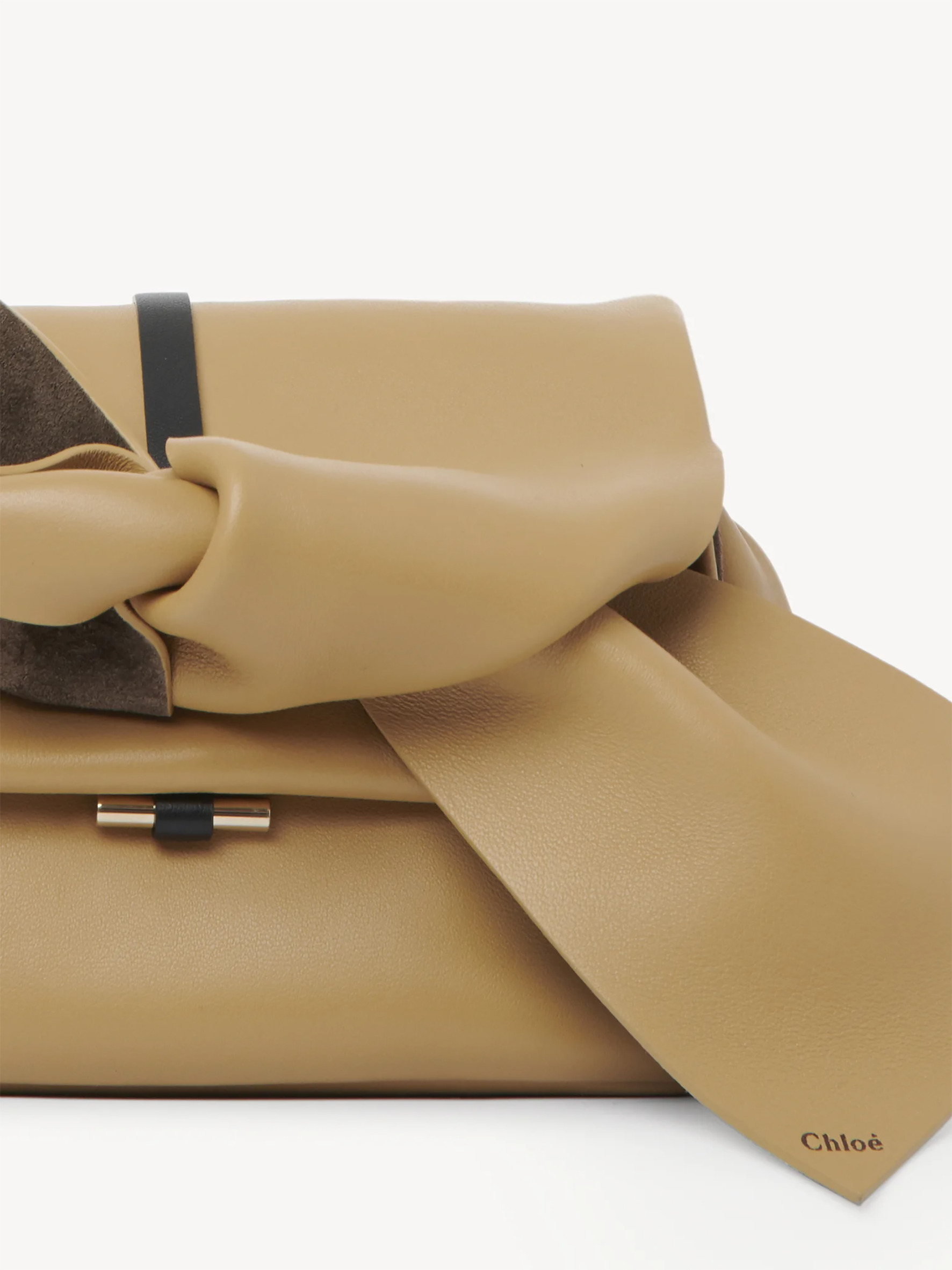 Em couro napa macio e desestruturado, ela tem um formato despojado, destacado por um laço maximalista desconstruído, símbolo que permeou a última coleção de Gabriela Hearst na Chloé. Como ele é feito a partir da amarração de uma faixa de couro, pode assumir uma série de formatos, conforme a preferência de quem estiver usando-a.