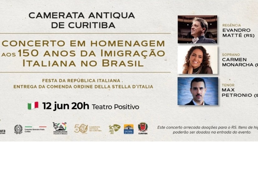 Segundo dados do Ministério das Relações Exteriores da Itália (2022), a estimativa é que haja cerca de 30 milhões de descendentes italianos no Brasil. Para celebrar esta data tão especial, que completa 150 anos em 2024, a Camerata Antiqua de Curitiba, apresenta no dia 12 de junho, às 20h o concerto em homenagem aos 150 anos da Imigração Italiana no Brasil.