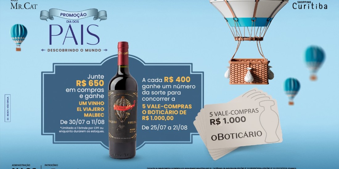 A promoção de Dia dos Pais do shopping tem patrocínio de O Boticário e apoio da Mr. Cat. “Desenvolvemos uma campanha ainda mais especial este ano, estamos com boas expectativas para a data. Além da parceria com marcas que fazem parte da vida de muitas famílias curitibanas, os nossos clientes terão a oportunidade de provar em primeira mão o vinho El Viajero Edición Especial. Temos certeza que será um sucesso”, comenta Bruna Habinoski, gerente de Marketing do Shopping Curitiba.