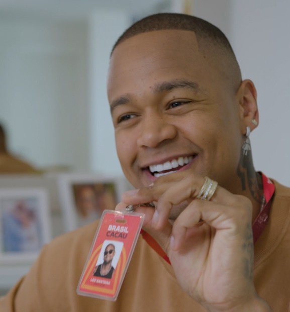 “Family, pega essa surpresa que recebi aqui: uma trufa GG da @chocolatesbrasilcacau, do tamanho da minha paixão por chocolate! E fico muito feliz em dividir uma super novidade com vocês. Sou o novo embaixador da Brasil Cacau! Com crachá e tudo!”, contou Leo Santana, que também é conhecido como GG.