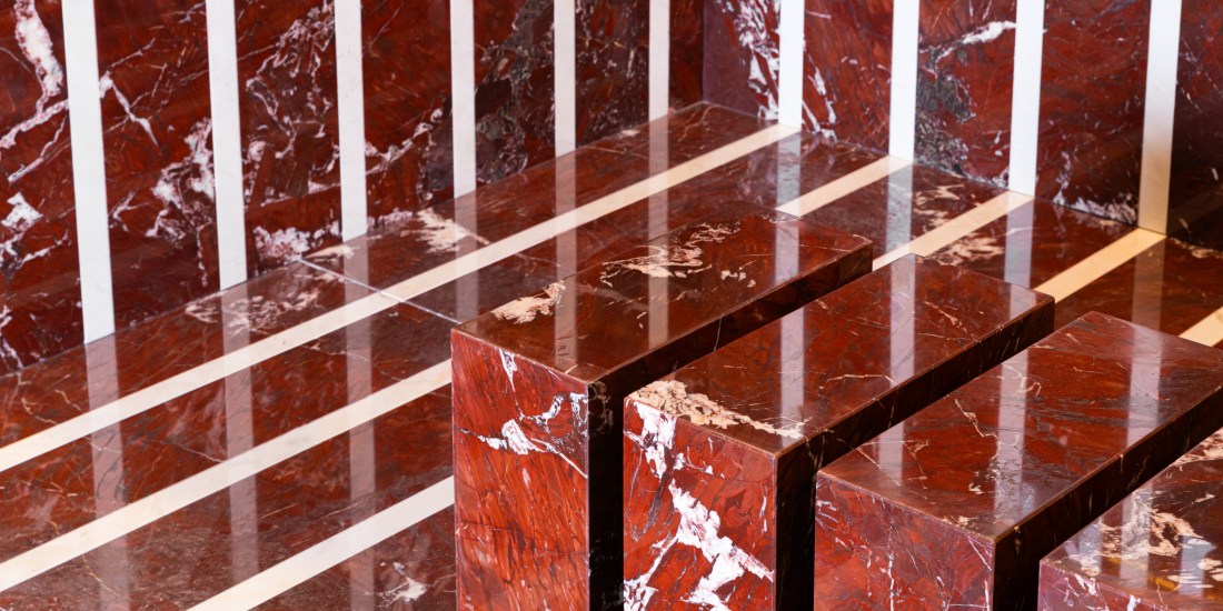 - Napoleon Bordeaux®: utilizado amplamente no interior do espaço, junto com Branco Michelangelo®. É um material raro, no Brasil e no mundo, uma verdadeira preciosidade, extraído com exclusividade pela Michelangelo. Aparece também de forma predominante no banco, com seu vermelho marcante e veios brancos e marrons, garantindo exclusividade ao ambiente.