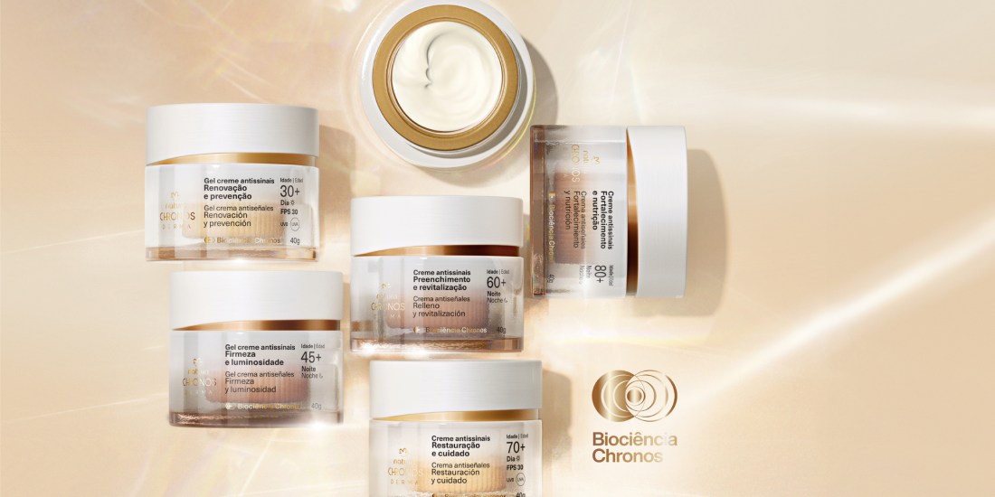 O envelhecimento cutâneo está diretamente ligado à senescência celular, um processo natural que compromete a saúde e a responsividade da pele, reduzindo sua vitalidade e acelerando o aparecimento de danos causados pelo envelhecimento. Pensando nisso, Natura Chronos Derma desenvolveu a Biociência Chronos, uma ciência inovadora e exclusiva que durou nove anos de estudos, para combinar bioativos potentes da biodiversidade brasileira e amazônica com dermoativos reconhecidos mundialmente, garantindo eficácia superior no tratamento dos sinais do tempo.