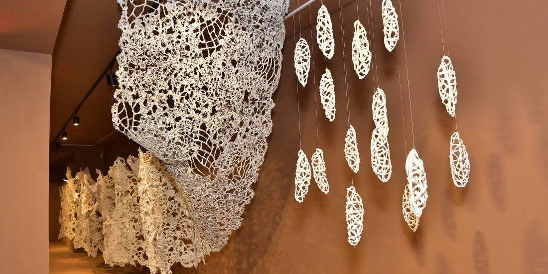Com curadoria do Sergio Gonçalves, a instalação dialoga com sua pesquisa artística, marcada pelo conceito de um “dossiê em forma de colcha de retalhos”, no qual fragmentos de vivências se alinham como fios invisíveis entre passado e presente. Suas esculturas e rendilhados carregam a sensibilidade de quem cresceu observando as mãos habilidosas da avó tecendo crochê e a mãe trabalhando com fios de seda – memórias que, ao longo dos anos, foram ressignificadas em sua arte. Seus casulos, formas entrelaçadas e texturas evocam o tempo, o acolhimento e a delicadeza do artesanal, trazendo um olhar poético sobre a materialidade.