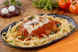 Parmegiana: Entrecot empanado na farinha panko, servido com tagliatelle na manteiga, polpa de tomate, tomate-cereja, muçarela de búfala e azeite de manjericão. Um prato reconfortante com um toque gourmet.