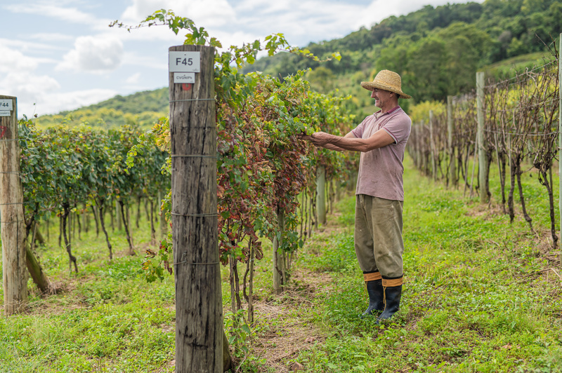 O cooperado Vanderlei Bera, no Vinhedo Experimental, onde são realizados testes com novas variedades para identificar as mais resistentes ao clima da região. Crédito Cesar Silvestro