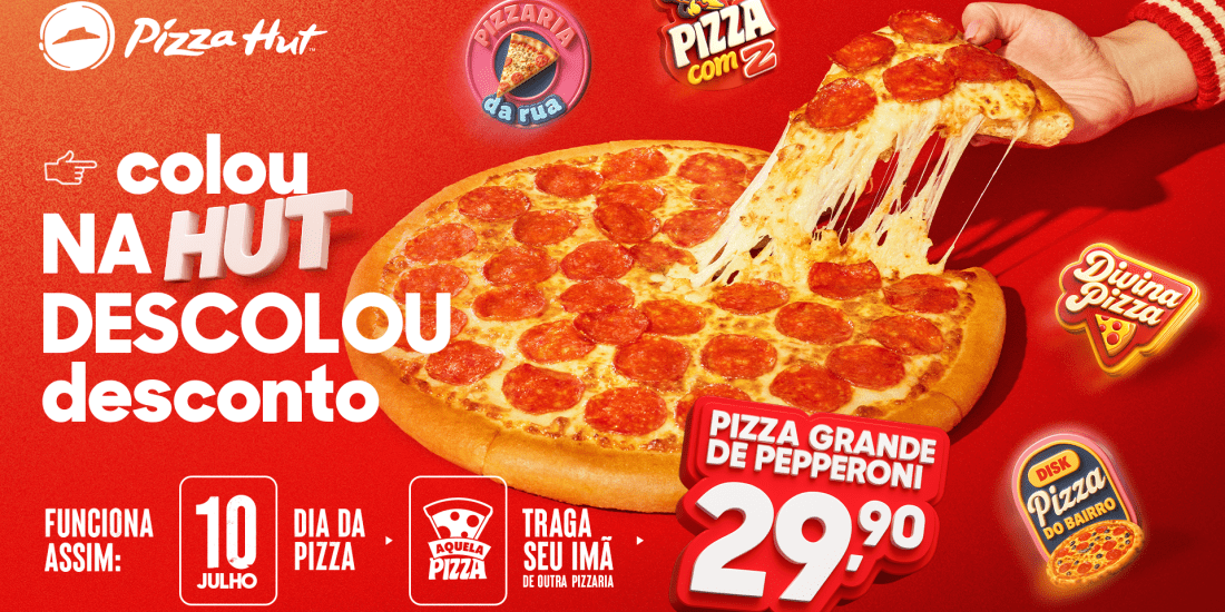 Se você tem um imã de pizzaria encostado na sua geladeira, pode comemorar: agora ele vale uma pizza grande de pepperoni por R$29,90. No Dia da Pizza, celebrado em 10 de julho, a Pizza Hut lança uma ação divertida e provocativa, que promete movimentar os balcões das lojas de todo o País*. Basta levar um imã de qualquer outra pizzaria até uma das mais de 260 unidades da rede e, por R$ 29,90, garantir uma pizza pan grande de pepperoni, um dos sabores mais icônicos da marca.