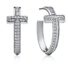 Brincos Tiffany T T1 em ouro branco com diamantes baguette e pavé