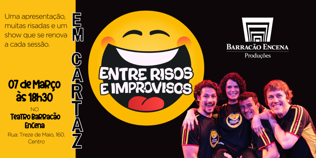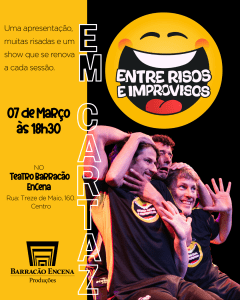 No dia 07 de março (sábado), às 18h30, o espetáculo Entre Risos e Improvisos entra em cartaz aqui no Teatro Barracão EnCena para uma apresentação imperdível.