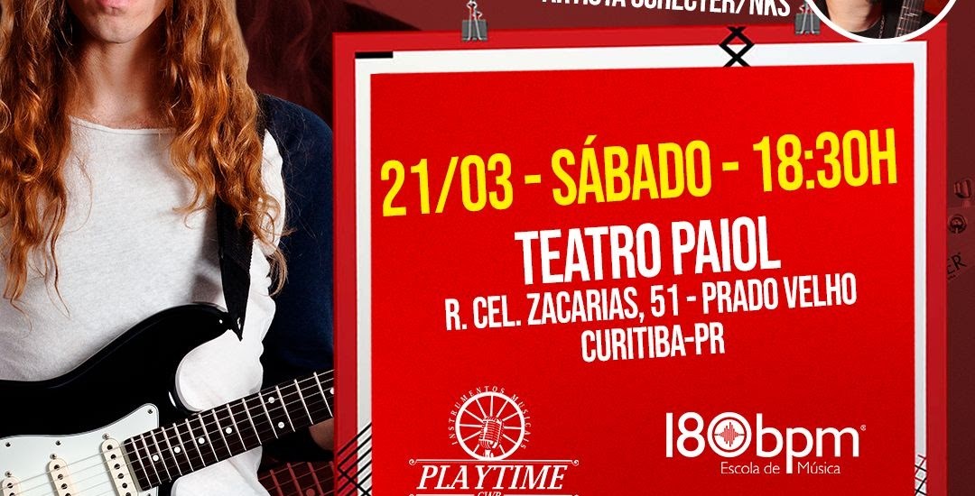 Evento com Nick Johnston acontece neste sábado (21) no Teatro Paiol e é realizado pela parceria entre a Escola de Música 180BPM e a loja de música Playtime CWB