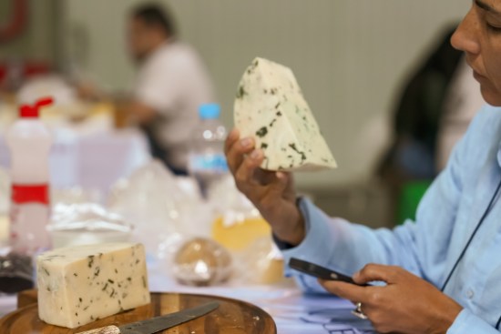 Juíza do Prêmio Queijo Brasil 2025 mostra pedaço de amostra após avaliação de suas características sensoriais. Foto: divulgação Festival Nacional do Queijo.